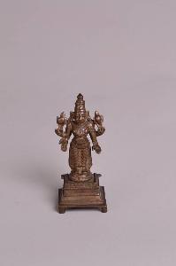 India. Visnu (?) a quattro braccia stante. Le mani superiori reggono entrambe una palmetta, le inferiori sono abbassate con i palmi aperti. Poggia su un basamento circolare a piani sovrapposti con quattro piedini.
