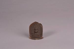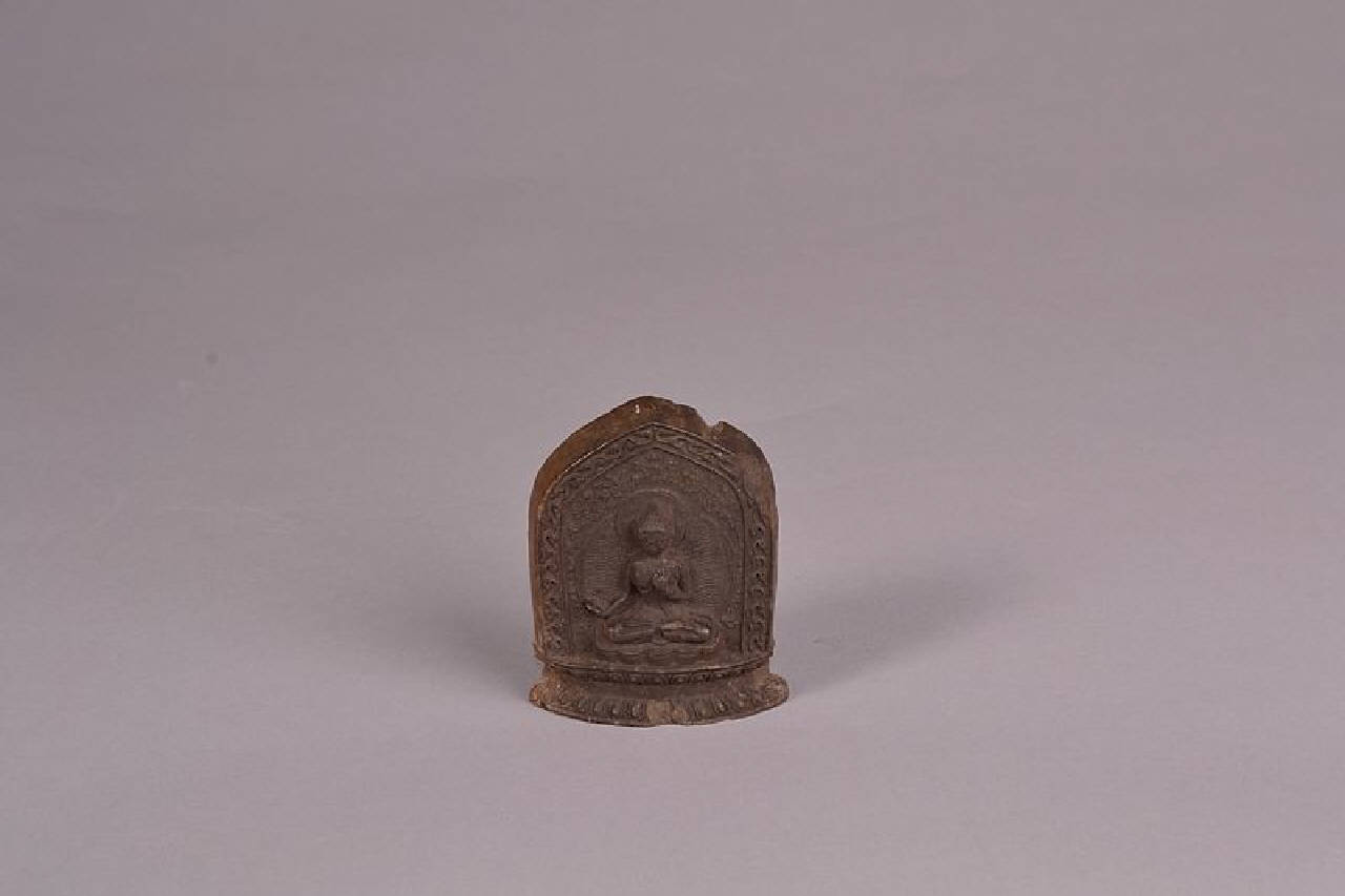 Tibet. Cretula votiva sha tcha tcha raffigurante il Buddha assiso sull trono di loto in ardhaparyanka che regge arco capa, dhanu e freccia saara. Iscrizioni in cinese sul lato posteriore recanti la data del regno Qianlong. La parte superiore delle iscrizioni presenti sul retro è cancellata.