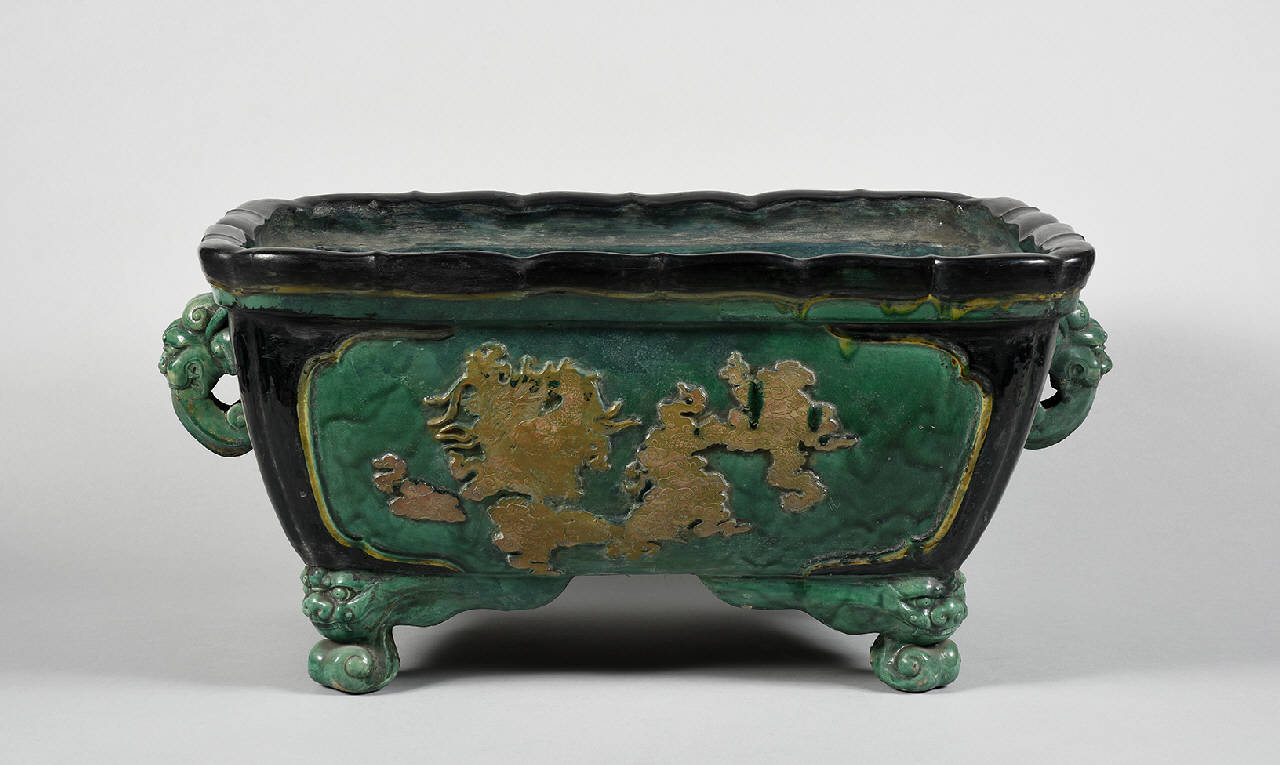 Grande vaso da giardino (?) in ceramica invetriata in verde, a sezione rettangolare leggermente rastremato alla base la quale poggia su quattro piedi a protomi di leone. Il bordo si presenta polilobto e sui lati si trovano caratteri cinesi e figure danzanti in basso rilievo. Sui due lati più stretti si trovano due manici a forma di testa di leone.
