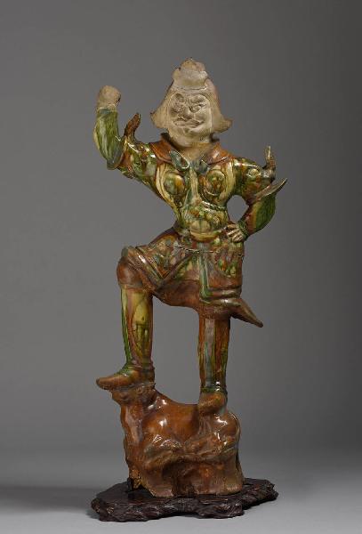 Scultura funeraria buddista, mingqi di tianwang (lokapala), re celeste e guardiano di tomba. Vestito tradizionalmente con corpetto d'armatura, stivali e cappello di peliccia, nella posizione calssica, stante su un piccolo bufalo nandi che poggia su una roccia, con il braccio destro alzato a pugno, ora mancante dell'arma. Ceramica con invetriatura a tre colori, sancai, bianco, verde, marrone. Moderna base in legno per sorreggere la statua.