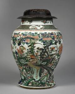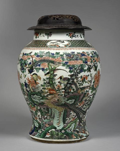 Grande giara in porcellana a smalti Famiglia Verde con applicazioni blu sopracoperta. Fitta decorazione floreale con una fenice fenghuang su roccia taihu, fra peonia mudan, melograno shiliu, pesco tao, e altri fiori e uccelli più piccoli. Coperchio in legno traforato.