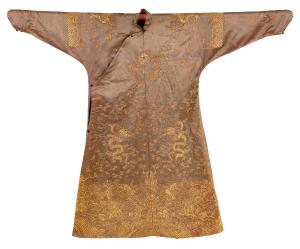 Veste in seta operata e ricamata con filo d'oro con motivo di draghi a cinque artigli tra nubi e onde sopra montagna sacra, su fondo bruno, imbottito, non foderato