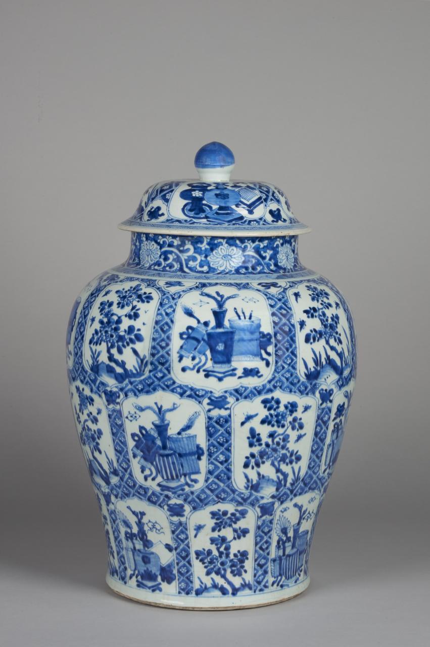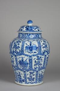 Grande giara con coperchio in porcellana bianca e blu.Dall'alto in basso triplice fila di otto cartelle decorate di ramo di fiori alternati incorniciati da fascia di piccoli rombi. Orlo a fiorami stilizzati. Coperchio decorato similmente a quattro cartelle di rami fioriti alternati a rami e oggetti.