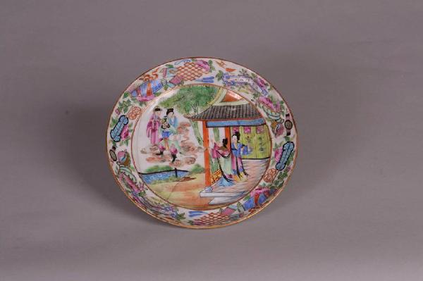 Piatto decorato in stile cantonese a smalti policromi sopracoperta. Famiglia rosa. Parte di un servizio di 6 piatti (rimanenti?) con decoro sulla tesa di simboli beneaugurali, "i cento oggetti antichi", e parte centrale raffigurante una scena parte del racconto rappresentato su tutto il servizio. Il racconto riguarda l'incontro fra divinità celesti e umani. In questo piatto sono rappresentate divinità celesti che lasciano un'abitazione e due dame che le salutano dalla veranda.