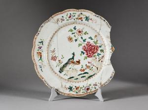 Grande piatto con bordo lobato e decoro di peonia, pavone e pavoncella nella cromia della famiglia rosa.