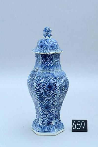 - NOTIZIE STORICO CRITICHE Costituisce una "garniture de cheminé" con C660, C664, C665.\nLa garnitura a cinque pezzi, il più delle volte composta con la configurazione di due vasi a tromba e tre vasi a balaustro con coperchio, è considerata un classico della porcellana cinese d'esportazione, a partire dalla fine del XVII secolo. David S. Howard scrive che "è chiaro dall'esame di questo carico del 1695 che la parte più importante erano vasi e garniture" (Choice of the private trader, pag. 236 ). Benché rapidamente adottato per la decorazione delle case europee alla moda e certamente molto popolare durante tutto il periodo d¿oro del commercio cinese, la garnitura a cinque pezzi deriva in realtà direttamente da un prototipo autoctono cinese. Ogni famiglia benestante in Cina aveva certamente nella propria abitazione un altare o un mobile impreziosito da una garnitura di cinque pezzi in porcellana, cloisonné o bronzo. Questi set erano di solito composti da un incensiere con coperchio in posizione centrale, una coppia di portacandele ai lati e da una coppia di vasi di forma gu, in posizione esterna. Un set di questa grandezza poteva essere collocato sulla mensola di un camino, mentre garniture dalle misure più massicce erano destinate a casa molto prestigiose, in cui le garniture erano esposte sul pavimento davanti al camino, oppure su mobili particolarmente imponenti. Esempi di garniture provenienti da musei collezioni private sono stati esposti al Victoria and Albert Museum di Londra durante la mostra Garnitures: Vase Sets from National Trust Houses 11 ottobre 2016-30 aprile 2017 (https://www.vam.ac.uk/exhibitions/garnitures#intro).(Mazzeo 2018)