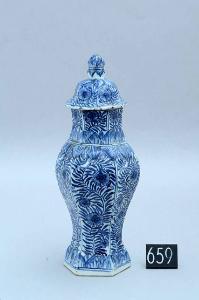Vaso a forma di piccola giara esagonale, con coperchio, in porcellana bianco e blu. La decorazione, che copre quasi tutta la superficie del vaso, presenta il motivo del fiore di loto, di uccelli e un altro fiore non meglio definito.