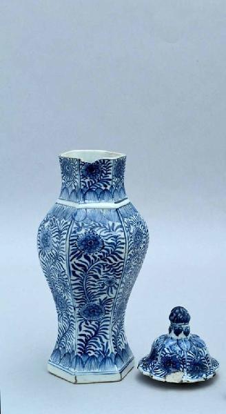 Vaso a forma di piccola giara esagonale, con coperchio, in porcellana bianco e blu. La decorazione, che copre quasi tutta la superficie del vaso, presenta il motivo del fiore di loto, di uccelli e un altro fiore non meglio definito.