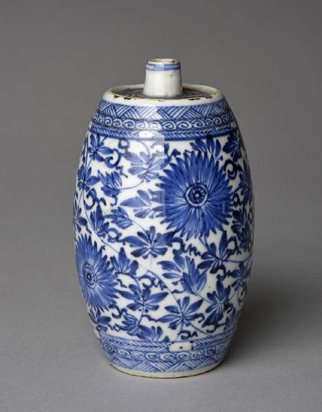 Vasetto a bussola a forma di botte con breve beccuccio che sporge superiormente al centro. Decoro bianco blu a fiori e tralci fioriti. Due fasce, una superiore, una inferiore, a motivi geometrici, agli estremi del corpo.