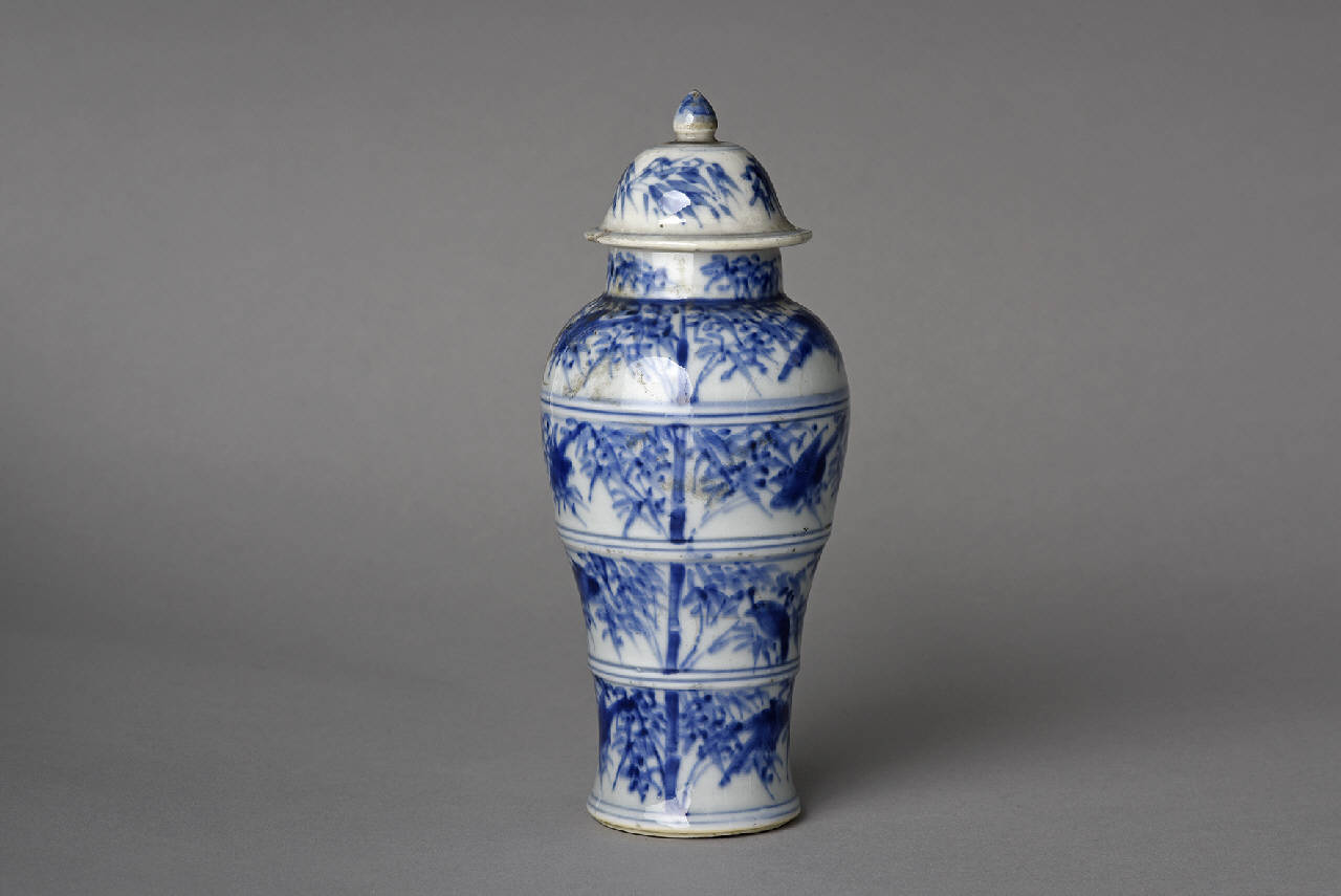 Vasetto a balaustro con coperchio dal profilo modanato con pomolo. Porcellana biancoblu con decoro a motivo di bambù su tutta la superficie e uccelli.