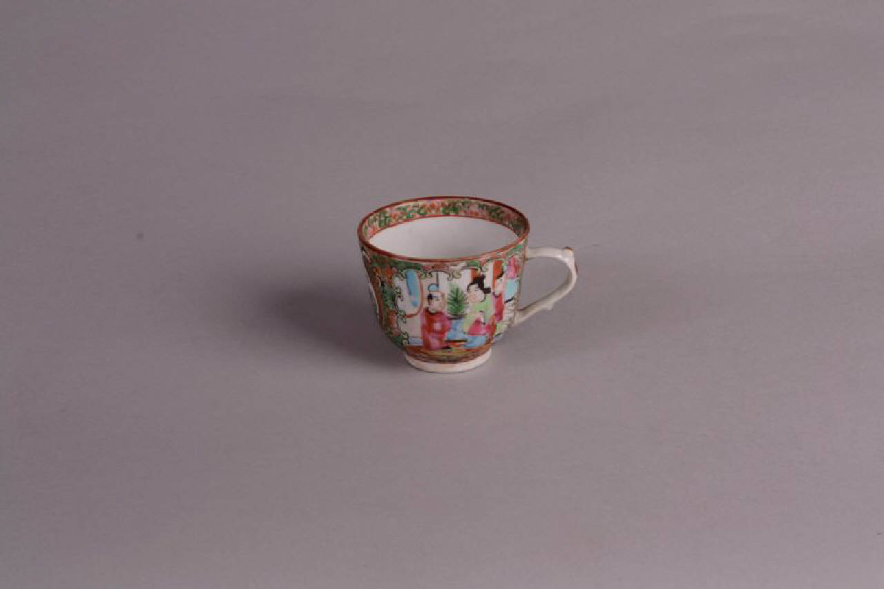 Tazzina da caffè con ansa ricurva. Decoro cantonese con fondo di fiori e farfalle e riserve entro le quali figurano fiori, uccelli e figure in scene di palazzo.