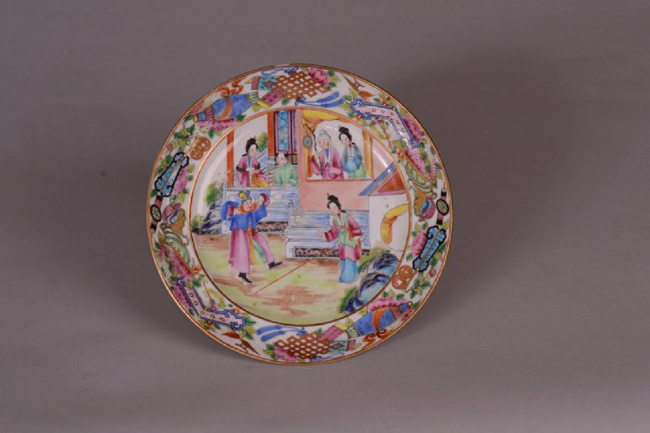 Piatto decorato in stile cantonese a smalti policromi sopracoperta. Famiglia rosa. Parte di un servizio di 6 piatti (rimanenti?) con decoro sulla tesa di simboli beneaugurali, "i cento oggetti antichi", e parte centrale raffigurante una scena parte del racconto rappresentato su tutto il servizio. Il racconto riguarda l'incontro fra divinità celesti e umani. In questo piatto è rappresentato un personaggio che, tenendosi la lunga barba rossa tra con le mani compie un'acrobazia davanti ad alcune dame.