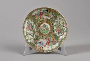 Piattino da caffè. Decoro cantonese con fondo di fiori e farfalle e riserve entro le quali figurano fiori, uccelli e e figure in scene di palazzo.