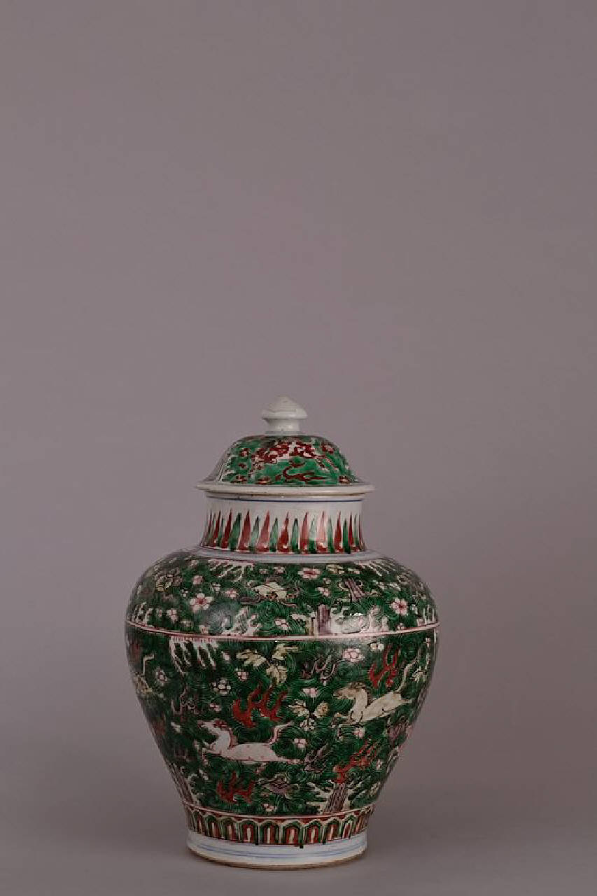 Giara dalla spalla alta con coperchio a pomolo, in porcellana Famiglia Verde a smalti verde, giallo, grigio e rosso. Decorato sul ventre, con figure di cavalli al galoppo fra spirali verdi, fiamme e fiori, sulla spalla gli otto emblemi buddhisti.