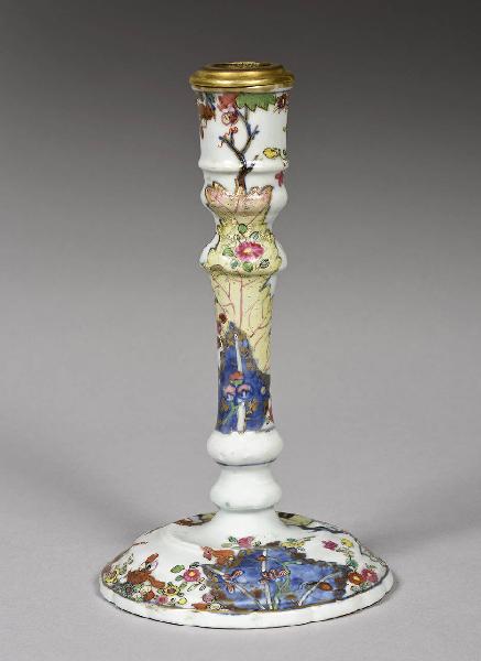 Famiglia rosa. Candeliere con decoro "foglia di tabacco" con bocca in bronzo dorato. Alto fusto marcato a più altezze da rigonfiamenti, poggia su un piattino convesso dall'orlo lievemente sagomato ed è stato fabbricato in tre pezzi e rinforzato all'altezz dell'orlo da una motatura metallica di origine europea.