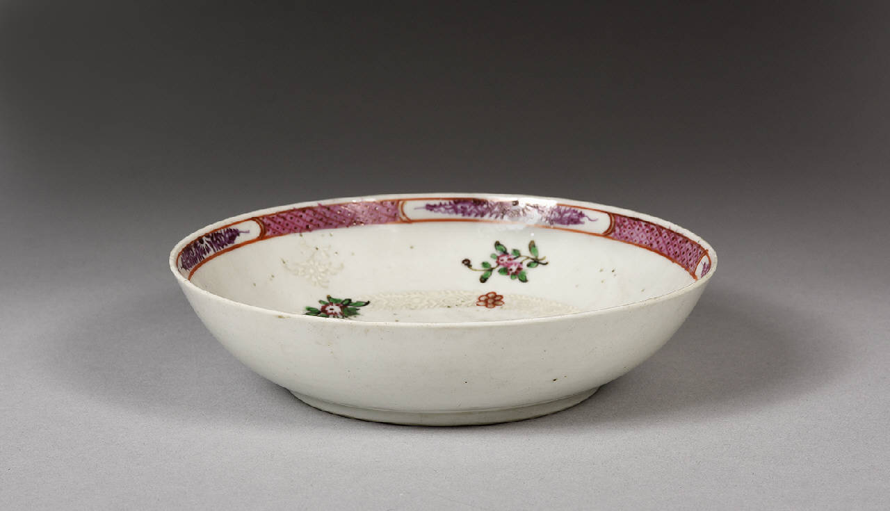Piattino in porcellana con fascia a smalti rosa lungo il bordo e fiorellini in rosa oro e verde e corolla interna ottenuta con smalti bianchi applicati sopra l'invetriatura.