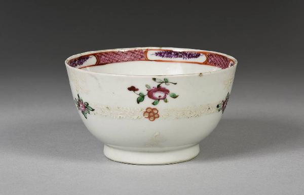 Tazzina in porcellana con fascia a smalti rosa lungo il bordo interno e fiorellini in rosa oro e verde, e corolla ottenuta con smalti bianchi applicati sopra l'invetriatura.