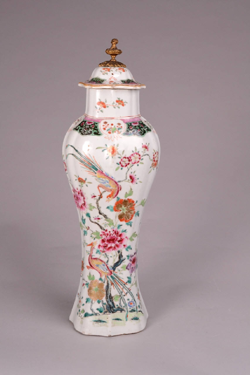Vaso a balaustro con coperchio di forma molto allungata e pianta polilobata. Coperchio con pomolo in ottone avvitato superiormente tramite un dado. Decoro di coppia di fenici tra rami di peonia in fiore negli smalti della famiglia rosa.