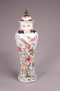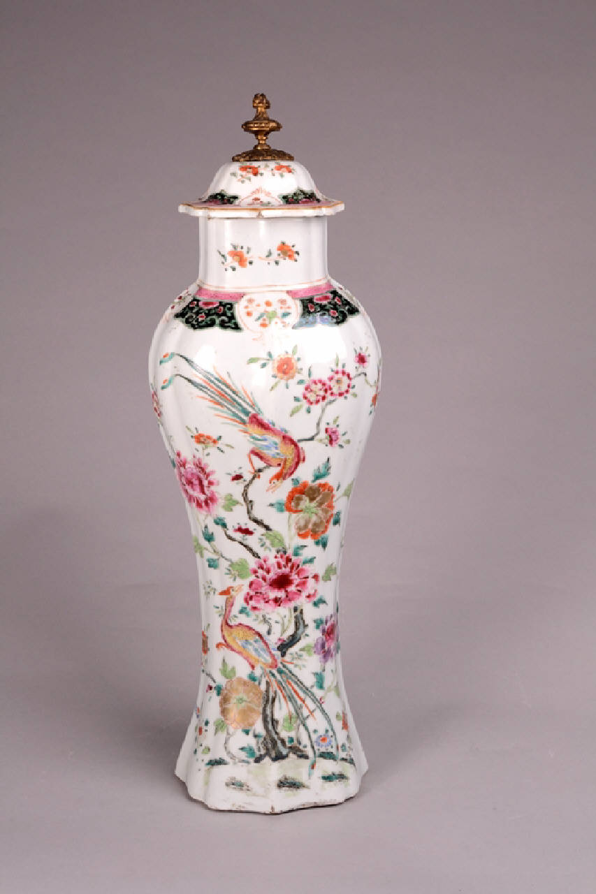 Vaso a balaustro con coperchio di forma molto allungata e pianta polilobata. Coperchio con pomolo in ottone avvitato superiormente tramite un dado. Decoro di coppia di fenici tra rami di peonia in fiore negli smalti della famiglia rosa.