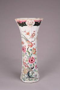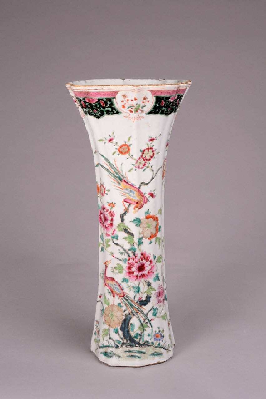 Vaso a tromba a pianta modanata con decoro di coppia di fenici tra rami di peonia in fiore negli smalti della famiglia rosa.
