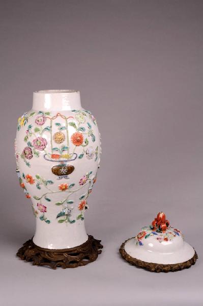 Vaso a balaustro con coperchio con terminale a forma di frutto, con decorazione applicata a smalti policromi raffigurante vari rami in fiore, vasi e ceste, su fondo bianco. Montato su una base in bronzo occidentale.