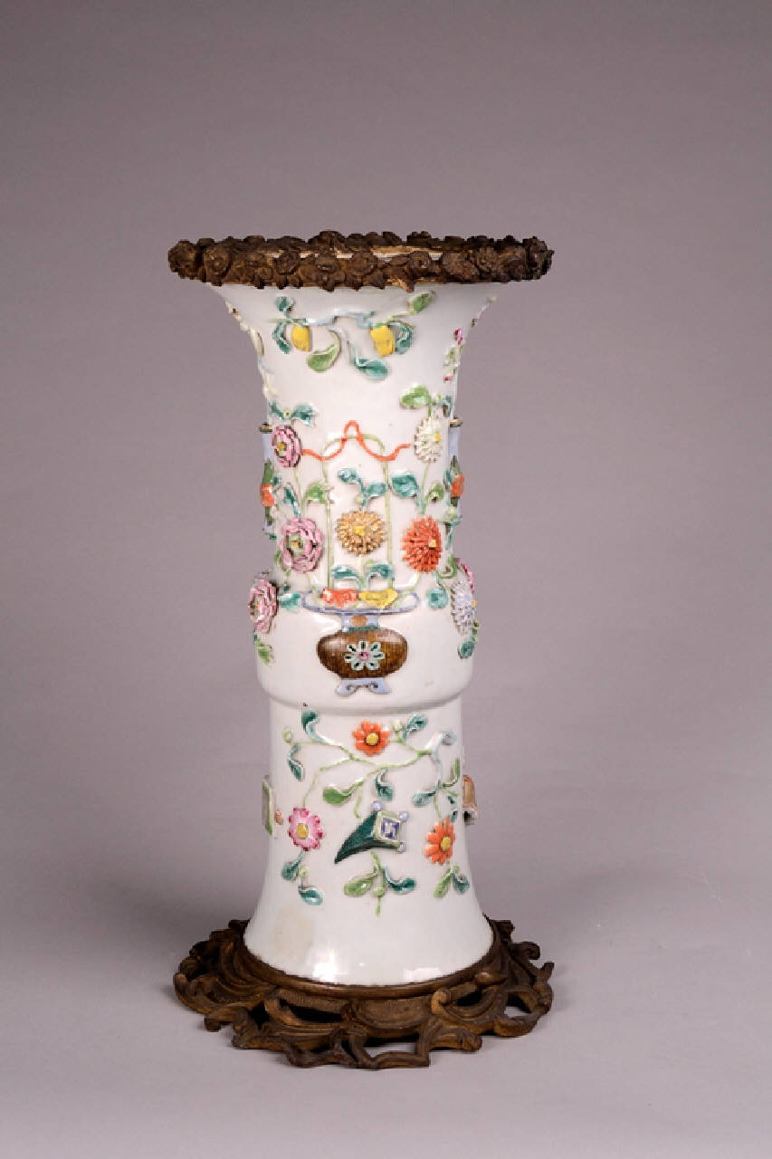 Vaso a tromba dalla forma arcaica "gu", con decorazione applicata a smalti policromi raffigurante vari rami in fiore, vasi e ceste, su fondo bianco. Montato su una base in bronzo occidentale.