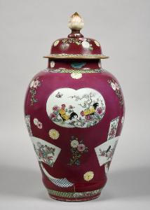 Grande vaso panciuto dalla spalla alta in porcellana decorato in smalti Famiglia Rosa con coppie di galletti gongji e motivi floreali riserve ovali e sagomate su fondo color rubino impreziosito da crisantemi,ju. il coperchio con pomolo a guisa di fiore di loto con decoro simile, bordato da banda a motivi geometrici verde chiaro con ulteriori decori a fiori che riprende il decoro al collo del vaso.