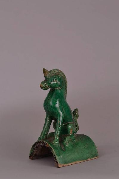 Tegola semicircolare in terracotta ad invetriatura verde, sormontata da un cavallo seduto a mò di cane, con le zampe anteriori ritte.