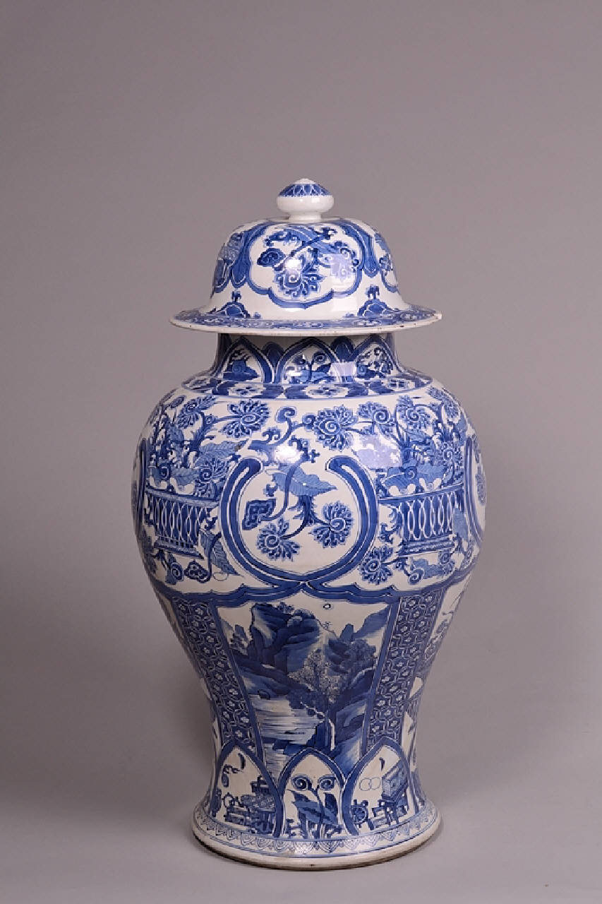 Grande vaso da pompa a balaustro in porcellana bianco blu.Panciuto e rastremato alla base, con coperchio a campana. Presenta una decorazione di cesti fioriti hualang entro le quattro cartelle maggiori. Nella zona convessa, ai lati delle cartelle principali, due cartelle con paesaggio montano. Alla base petali di loto con all'interno oggetti sacri. La medesima decorazione sul coperchio.