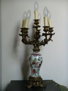 Vasetto a piede rastremato e breve collare cilindrico. Decorazione policroma in smalti famiglia rosa di peonie e due galli di cui uno appollaiato su un arbusto. In alto, fregio arabescato in rosa con fiorellini. Sul collo, piccoli tralci fioriti. Montato in bronzo dorato a lume con portalampada.