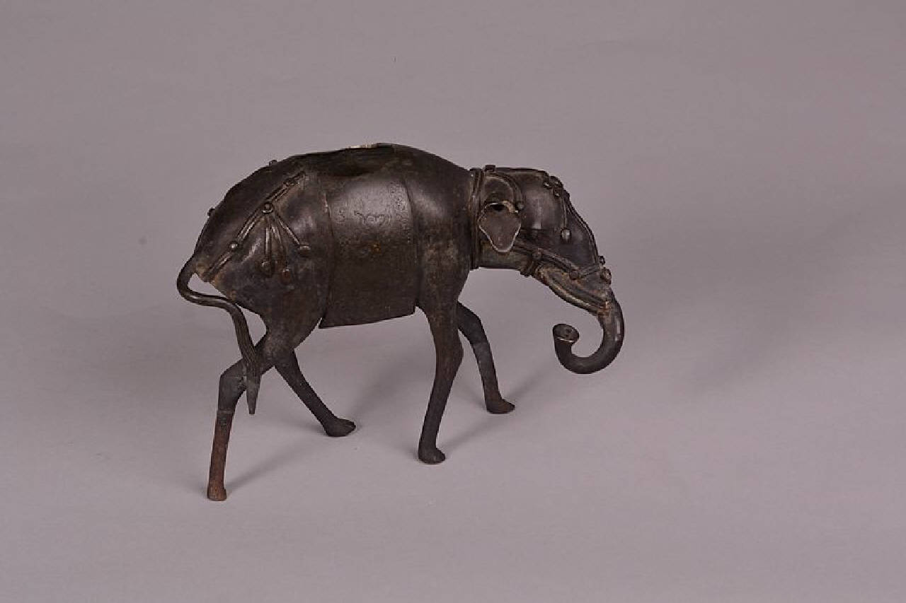 Bruciaprofumi in bronzo a foggia di quadrupede con testa allungata e proboscide. Porta una bardatura ornamentale e una gualdrappa a fregi incisi