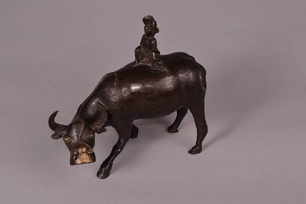 Bufalo in bronzo con la testa girata a sinistra. Un vecchio sul dorso. Una corda passa nel naso del bufalo.