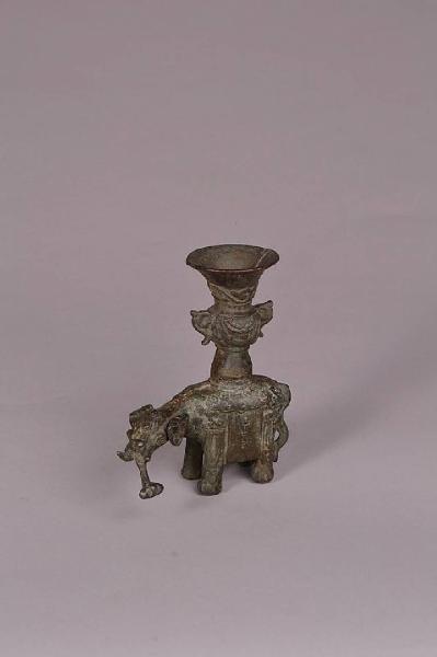 Scultura in brionzo raffigurante elefante con sella ornamentale e con vaso rituale gu sul dorso, la testa rivolta verso sinistra. In coppia con C765.