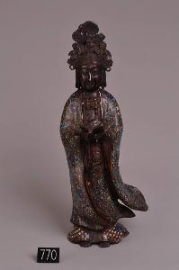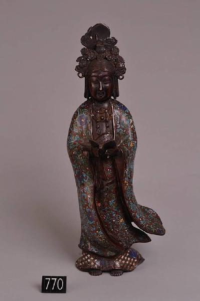Statua femminile in abito cinese con simbolo solare fra i capelli. Regge un libro aperto fra le mani. Champlevé con smalti rosso, blu, bianco, verde e azzurro. Marca del regno Xuande.