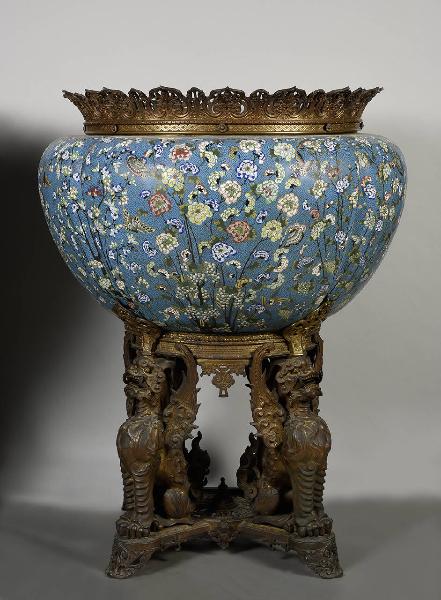 Grande jardinière lobata in metallo cloisonné a fondo turchese, decorata con farfalle e uccelli in volo tra rami di peonie e crisantemi e farfalle con bordo superiore in bronzo dorato traforato. La base in bronzo dorato composta da quattro leoni alati seduti su piattaforma con supporti a volute.