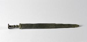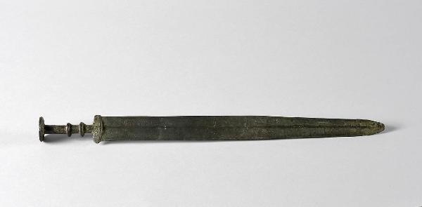 Daga in bronzo patinato con lama a sezione romboidale ed iscrizioni cinesi. Impugnatura in bronzo tornita con semplici ornati, pomo a forma di bottone decorato.