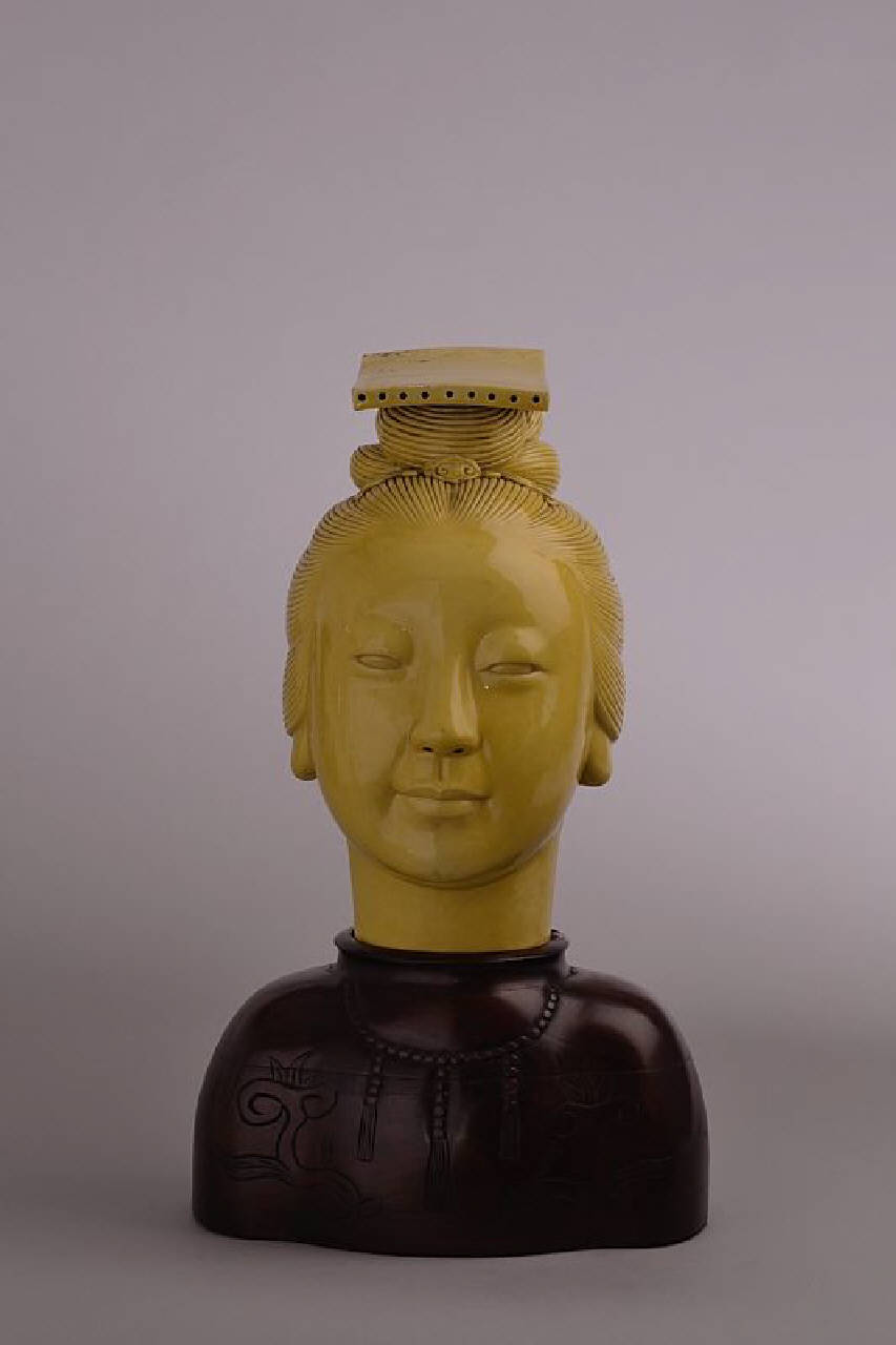 Scultura in porcellana a invetriatura monocroma gialla raffigurante testa di dama con elaborato copricapo. La base in legno scolpita con collana e motivo della veste.