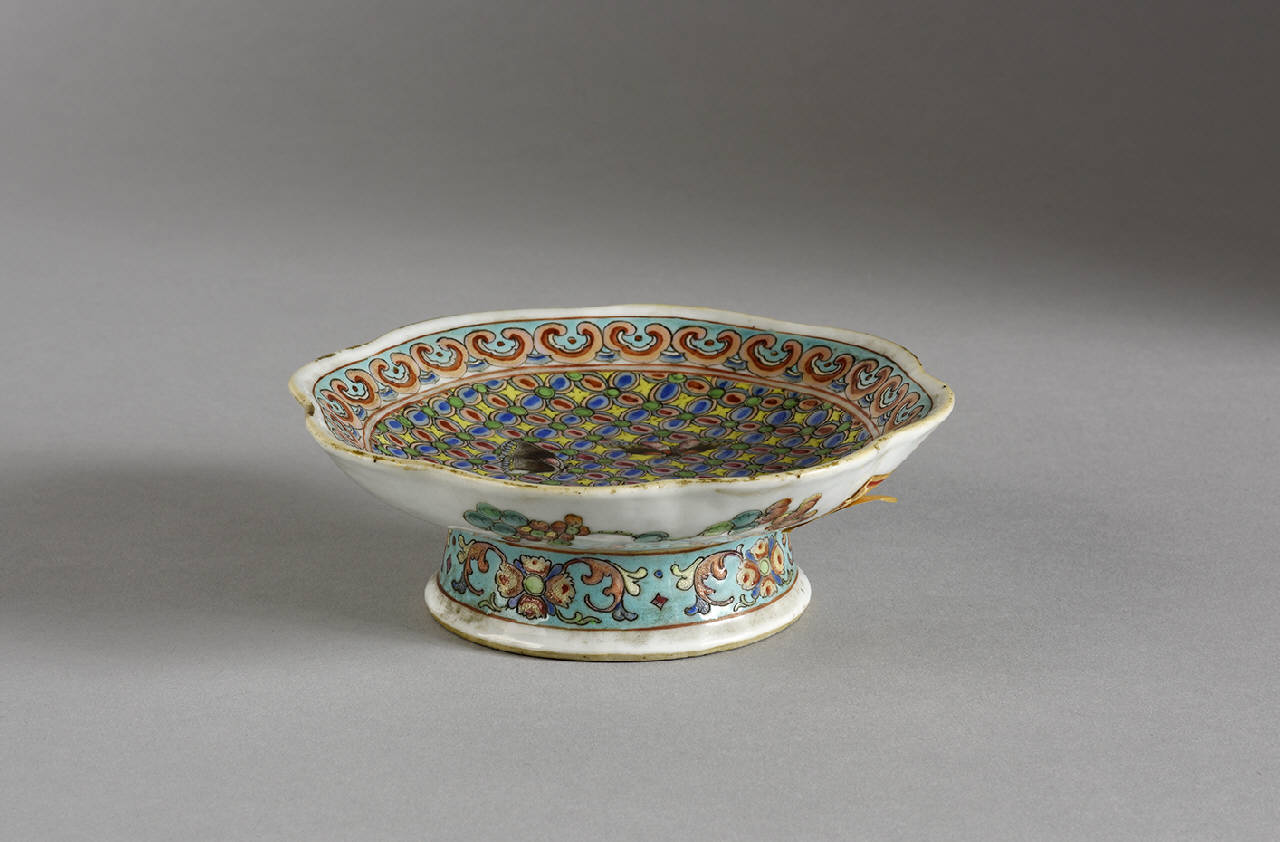 Piccola alzata in porcellana a pianta polilobata con decoro a smalti policromi. Superiormente è riprodotto un fondo a motivo floreale ripetuto sopra il quale sono disegnati alcuni fiori e tre farfalle. Bordo decorato a fascia verde con motivo ripetuto di fungo augurale a corolla di rosa. Piede decorato con girali fitomorfi su fondo verde. Alla base marchio a sigillo Tongzhi e del periodo (1862-1874).