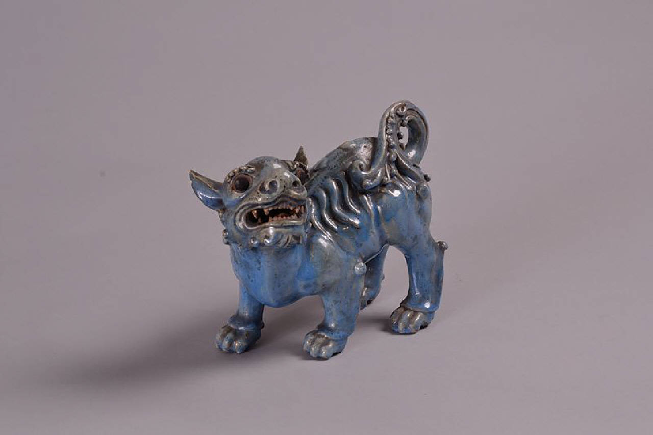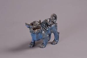 Leoncino cinese o cane di Fo in versione moderna con la testa girata verso sinistra. Terracotta invetriata in blu risparmiando occhi e l'interno della bocca. In coppia con n.805