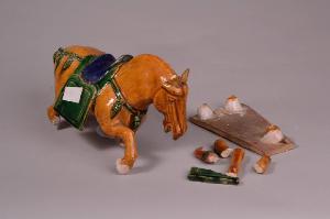 Cavallo in terracotta invetriata blu, verde e ambra. L'animale, sellato, è in atto di impennarsi e solleva la zampa anteriore destra.