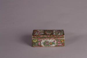Scatola con coperchio di forma rettangolare diviso internamente in due parti, in porcellana a smalti Famiglia Rosa Cantonese decorata con cartelle alternanti figure in scene di palazzo e uccelli e farfalle tra rami in fiore, contornati da ulteriore fitto motivo floreale su fondo oro
