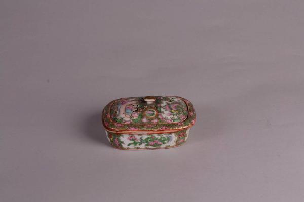 Scaldavivande in porcellana costituito da tre pezzi montati uno sull'altro: un coperchio rettangolare con pomello rettangolare, una vaschetta a pianta rettangolare con il fondo forato, fondina a pianta rettangolare. Decorazione con smalti della Famiglia Rosa nello stile di Canton con cartelle alternanti figure in scene di palazzo e uccelli e farfalle tra rami in fiore, contornati da ulteriore fitto motivo floreale su fondo oro