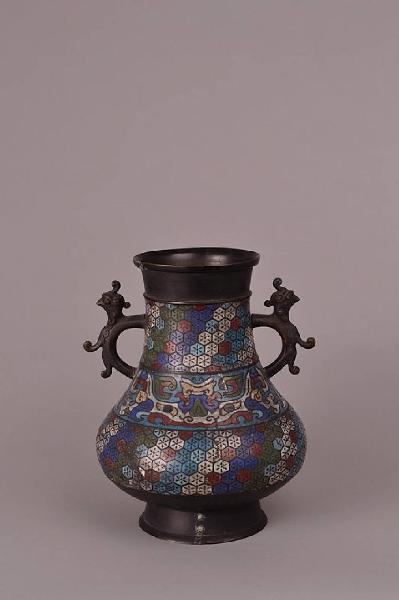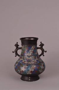 Vaso in bronzo smaltato cloisonné a ventre espanso rastremato al collo dal quale sporgono due manici con tedta d'uccello. Decorazioni a smalti blu, azzurro, bianco, avorio, rosso e verde a tre fasce, due con esagoni ed una centrale con maschera taotie. Sigillo sul fondo.