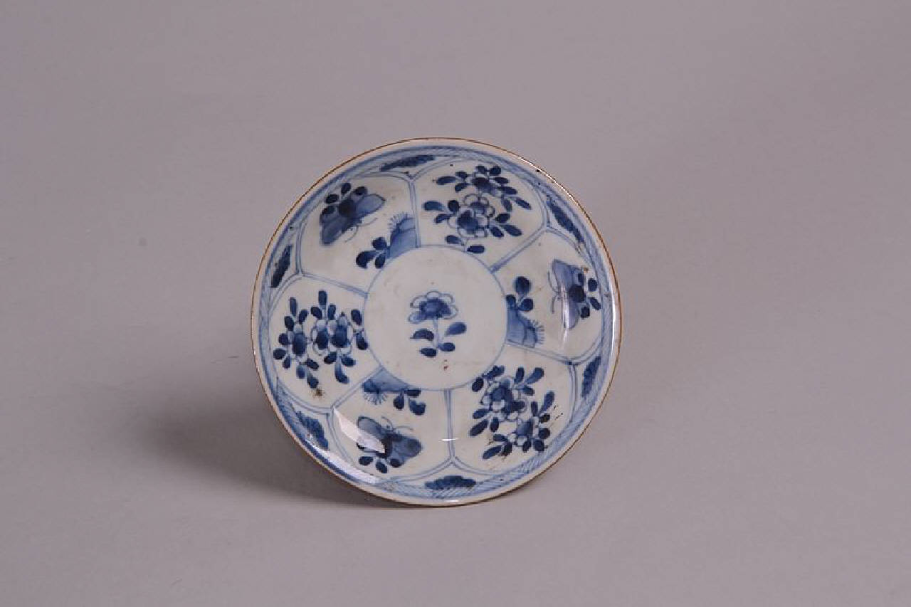 Piattino in bianco e blu con verso color caffelatte e fondo bianco. Decoro con fiore centrale entro cerchio dal quale si dipartono radialmente sei cartigli con motivi di fiori e farfalle alternati, terminanti vicino al bordo, sottolineato da una bordura a segmenti.