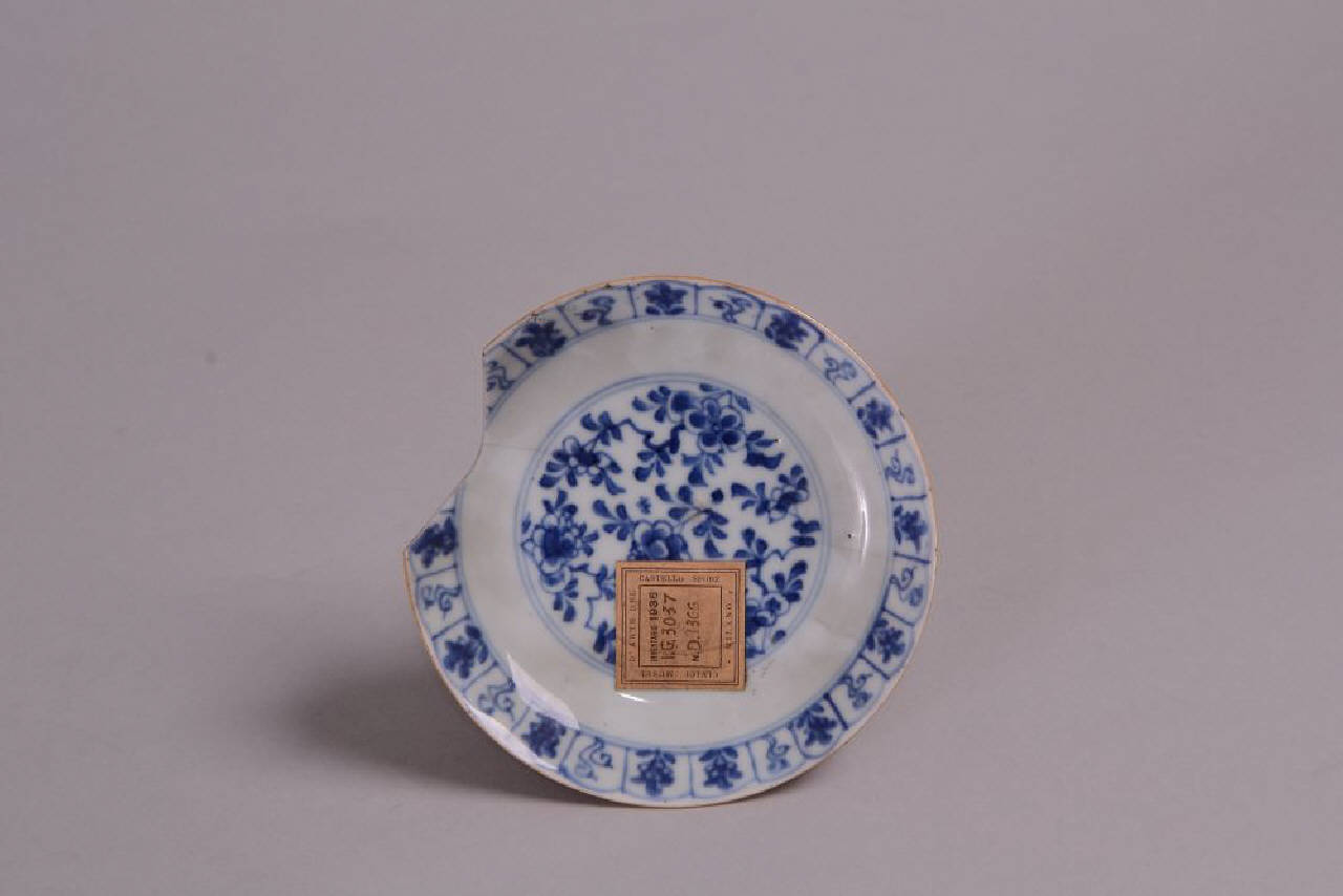 Piattino con decorazione in bianco e blu con verso color caffelatte e fondo bianco. Decoro centrale con fiori entro doppio campo circolare, sul bordo fregio di motivi floreali stilizzati.