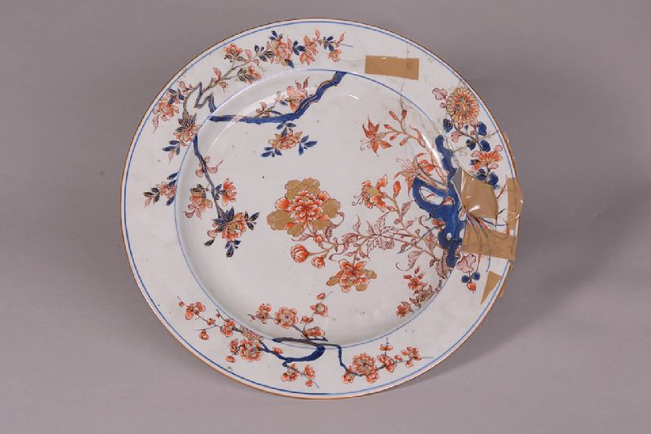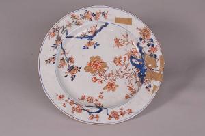 Piatto con decorazione tipo "Imari" in blu sottocoperta e rosso e oro sopracoperta. Racemo centrale con fiore di peonia che spunta da roccia forata, HU, crisantemo e altri fiori.