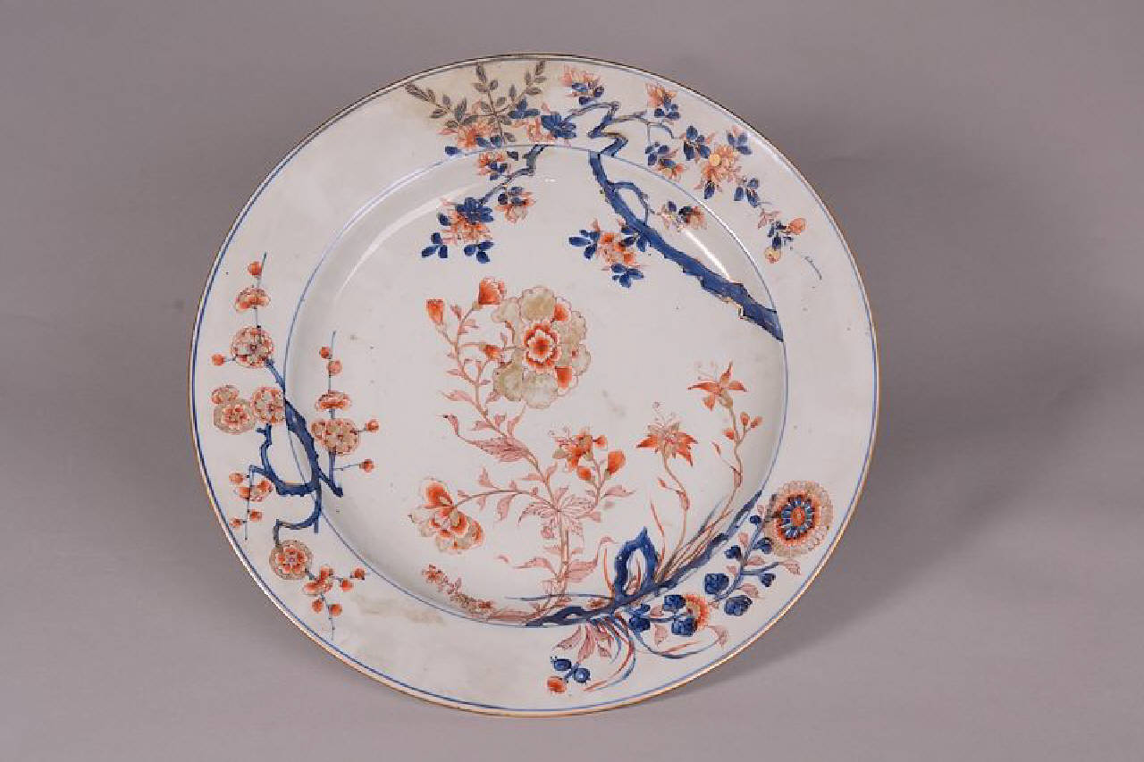 Piatto in porcellana a smalti Imari in blu sottocoperta e rosso e oro sopracoperta decoro con racemo centrale con fiore di peonia che spunta da roccia forata, crisantemo e altri fiori.