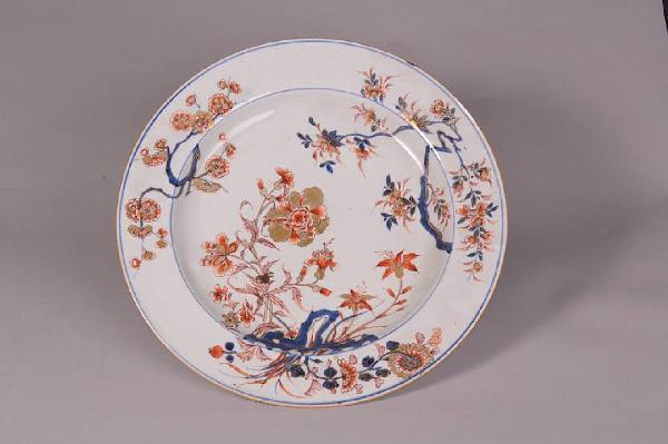 Piatto in porcellana a smalti Imari in blu sottocoperta e rosso e oro sopracoperta decoro con racemo centrale con fiore di peonia che spunta da roccia forata, crisantemo e altri fiori.