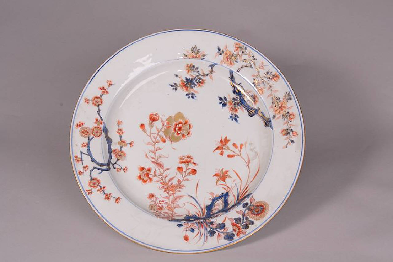 Piatto in porcellana a smalti Imari in blu sottocoperta e rosso e oro sopracoperta decoro con racemo centrale con fiore di peonia che spunta da roccia forata, crisantemo e altri fiori.