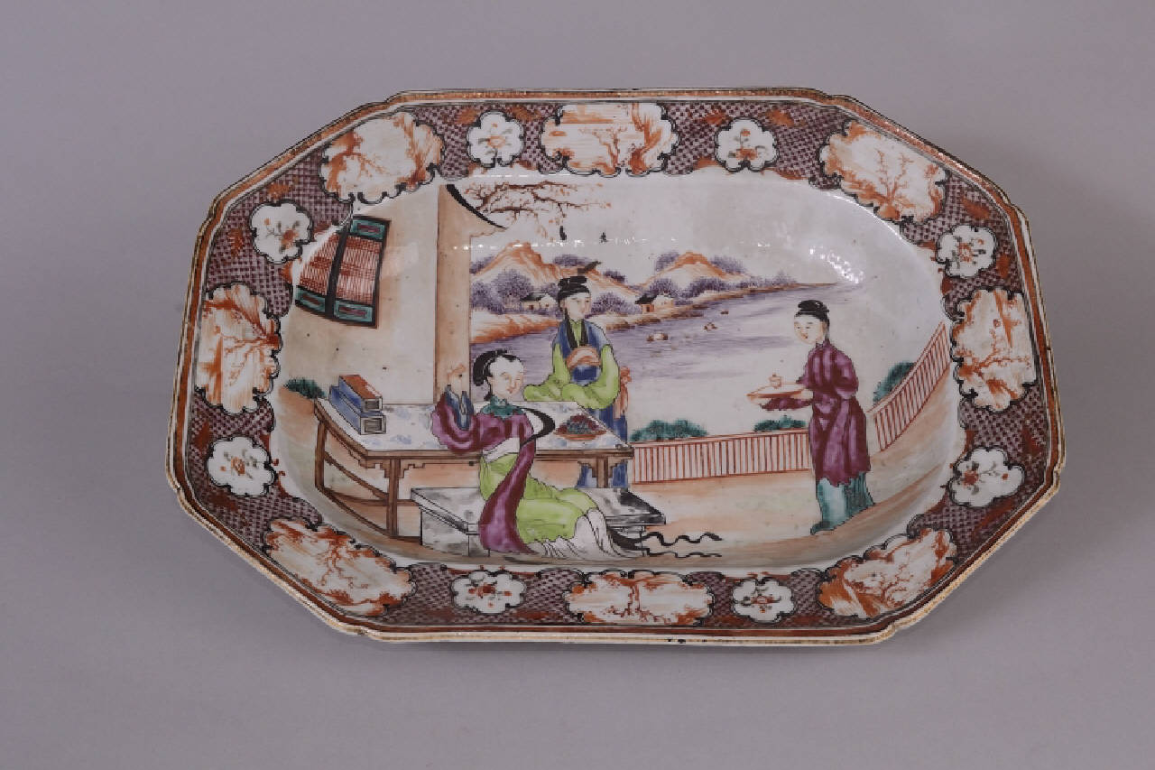 Grande vassoio fondo per zuppiera. Decoro in stile cantonese a smalti color lavanda: in un giardino una nobildonna seduta su una panca è assistita da due dame, una delle quali le porge una tazza su un vassoio.\nLo sfondo, di rombi color lavanda con puntino a un vertice, è interrrotto da cartigli a nuvola con immagini stilizzate di paesaggio e decoro floreale.